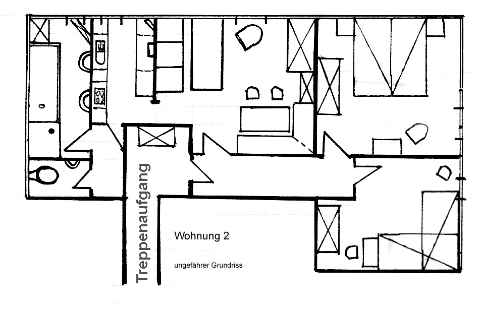 So richtig gemütlich...ist unsere Mansardenwohnung im Bauernhaus. Sie ist geeignet für bis zu 4 Personen (ca. 65 qm) und ist mit 2 Schlaf- zimmern (Elternschlafzimmer mit Doppelbett, Kinderzimmer mit Etagenbett), einem extra Wohnzimmer mit gemütlicher Couch,Kabel-TV und Essecke; einer voll ausge-statteten Küche und einem großen Bad mit Badewanne, Dusche und 2 Waschbecken; sowie einem extra WC ausgestattet. Kostenloses WLAN, ein separater Eingang und ein gemütlicher Freisitz mit Gartenmöbeln gehören ebenfalls dazu. Parkplatz direkt im Hof. |
